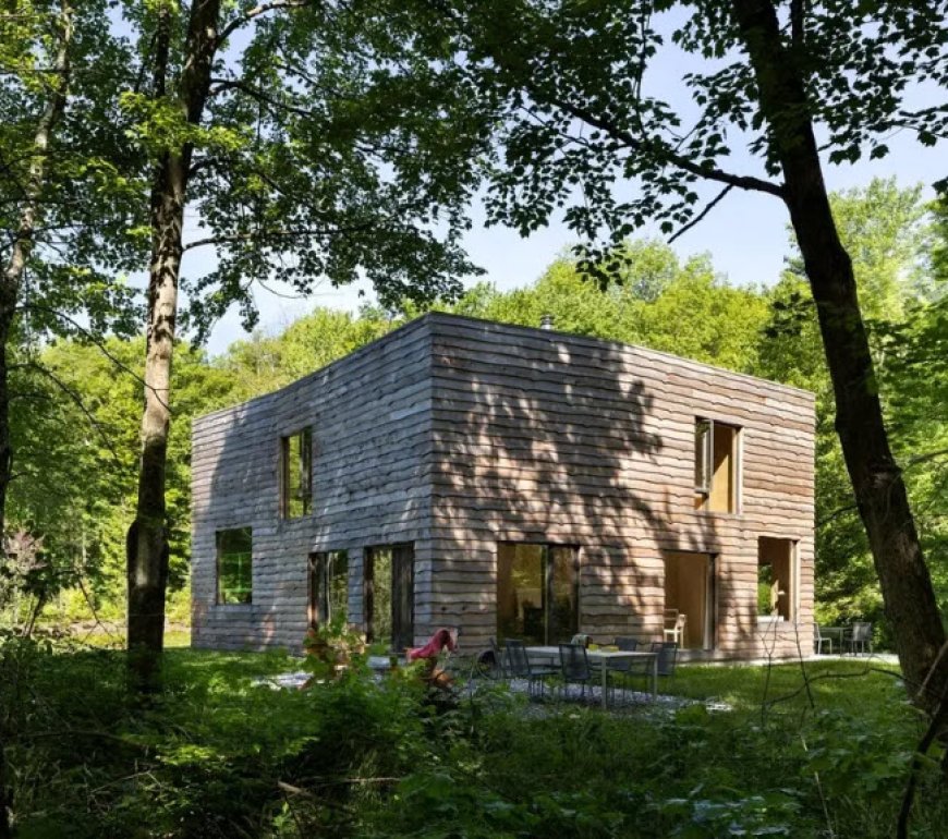 اریک بانج و میمی هوآنگ، بنیانگذاران nArchitects، این کلبهی کنار دریاچه را در درهی هادسنِ نیویورک بهعنوان اقامتگاهی طبیعی برای خانوادهی خود طراحی کردند. این دو برای کاهش نگرانیهای زیستمحیطی، سازهی خانه را با استفاده از CLT (چوب لایهای متقاطع) اجرا کردند.