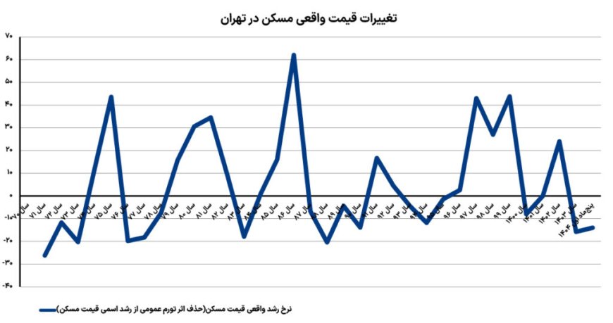 در سال 1403، قیمت واقعی مسکن به معنای حذف اثر تورم عمومی از روند رشد قیمت اسمی، 14 درصد کاهش یافت که افت قابلتوجهی در مقایسه با رشد مثبت قابلتوجه قیمت واقعی مسکن در سالهای قبل از آن است. طی 5 ماه اول امسال نیز از آنجا که ریسک تنش نظامی بیشتر شد و به جنگ 12روزه انجامید، قیمت واقعی افت بیشتری نسبت به یکسال قبل از آن تجربه کرد؛ منفی 15.8 درصد.