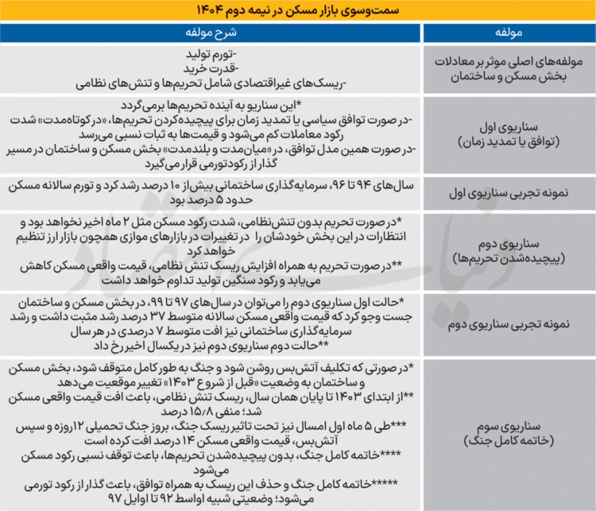 صحنهگردانان بازار مسکن در نیمسال دوم، سه کارگردان - یکی داخلی و مابقی خارجی - است؛ تورم تولید، فرجام آتشبس و آینده تحریمها. بر این اساس، سه سناریو برای قیمت مسکن و نبض سرمایهگذاریهای ساختمانی قابل تحلیل و برآورد است. یک سناریو میتواند «توافق» باشد. سناریوی دوم، «پیچیدهترشدن تحریمها» است که در این صورت، روند کاهشی ۵ماه اخیر «قیمت واقعی مسکن» با تغییراتی همراه میشود. سناریوی سوم در صورت «خاتمه کامل جنگ» قابل تصویر است. در این بررسی برای هر کدام از سناریوها، ارقام مربوط به تجربه دورههای قبل بازار مسکن تشریح شده است.