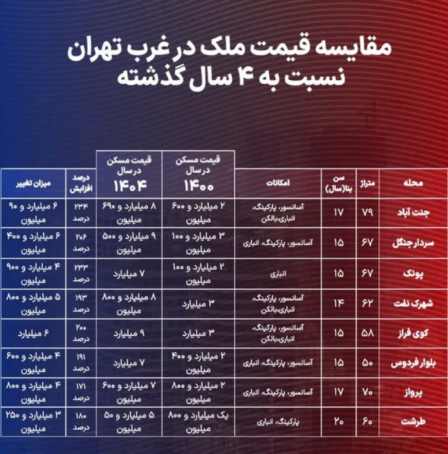 پایه داده‌های ثبت‌شده از فایل‌های مسکونی در چند محله غرب تهران، مقایسه قیمت‌ مسکن در سال‌های ۱۴۰۰ و ۱۴۰۴ نشان می‌دهد که نرخ هر متر واحدهای مشابه در این مناطق طی چهار سال با افزایشی بین 170 تا 230 درصد همراه بوده است. در این گزارش، تغییرات قیمت، درصد رشد و ویژگی‌های ملک برای هشت محله غربی پایتخت ارائه شده است.