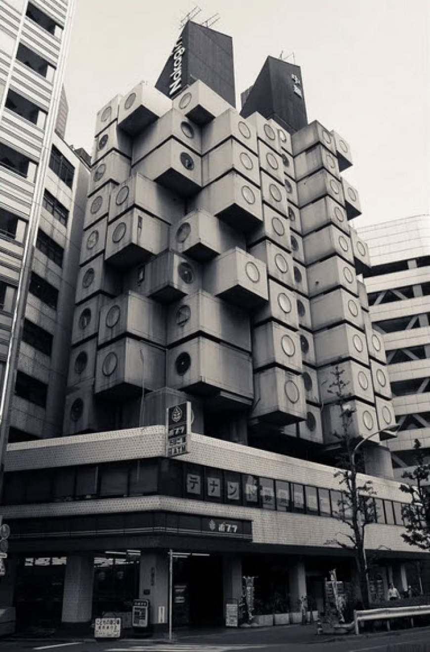 برج کپسولی ناکاگین در توکیو، اثری انقلابی از کیشو کوروکاوا و جنبش متابولیسم بود که در سال ۱۹۷۲ تکمیل شد. ایدهی اصلی این ساختمان، امکان «ارتقا» یا تعویض کپسولهای مسکونی ۱۰ متری آن مانند گوشی موبایل بود تا با نیازهای متغیر ساکنان تطبیق یابد و بنا هرگز پیر نشود.