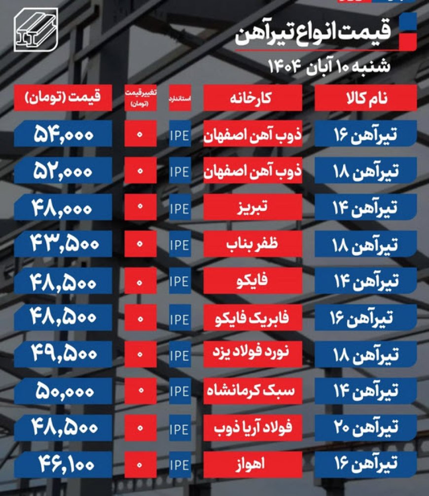قیمت تیرآهن امروز ۱۰ آبان ۱۴۰۴ اعلام شد. بازار تیرآهن روزهای آرامی را پشت سر میگذارد.