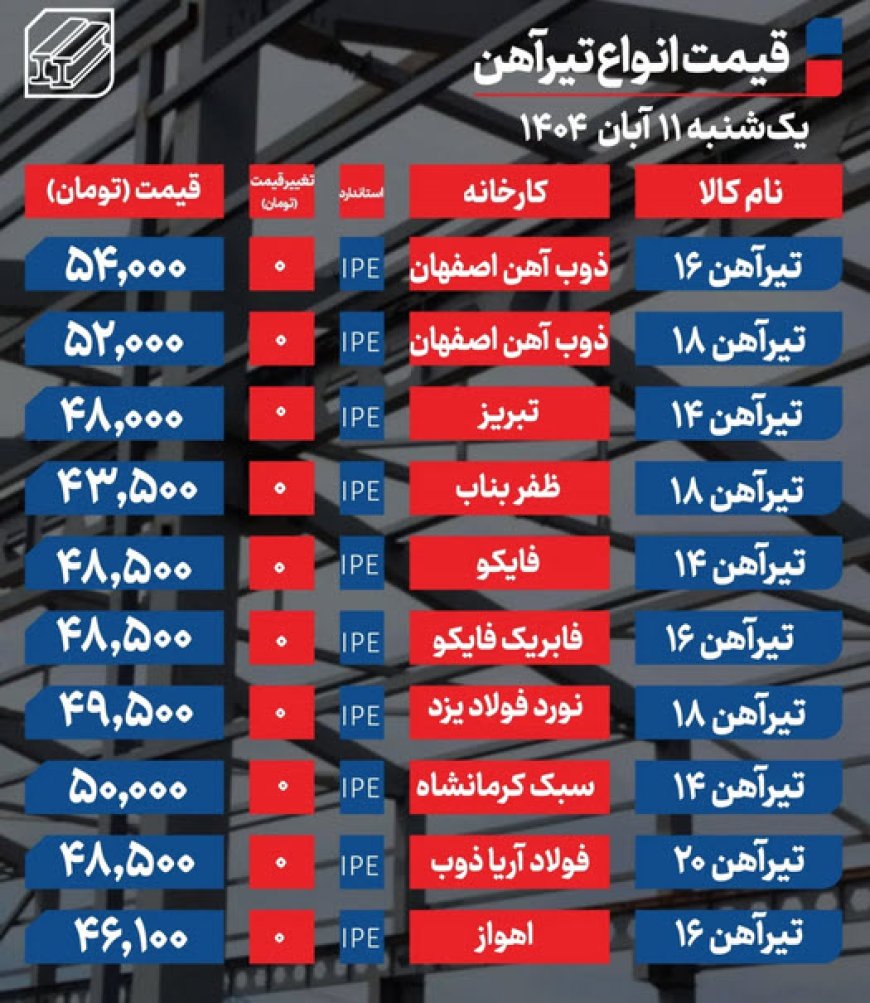 قیمت تیرآهن امروز ۱۱ آبان 1404