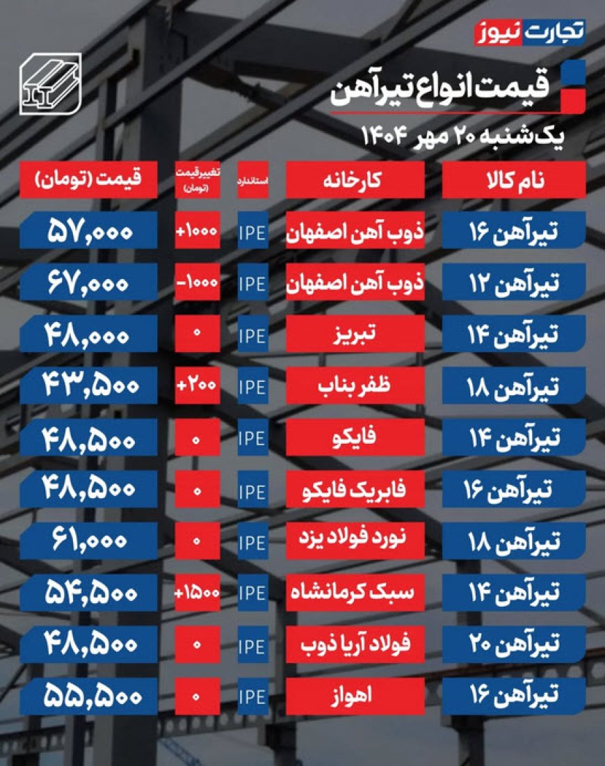 قیمت تیرآهن امروز ۲۰ مهر ۱۴۰۴ اعلام شد. در حالیکه بیشتر کارخانهها نرخهای روز گذشته را حفظ کردند، برخی مقاطع با تغییرات جزیی همراه شدند.