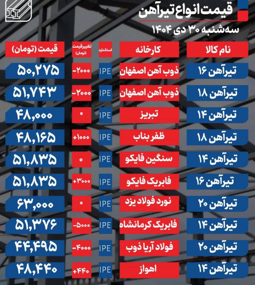 قیمت تیرآهن امروز ۳۰ دی ۱۴۰۴