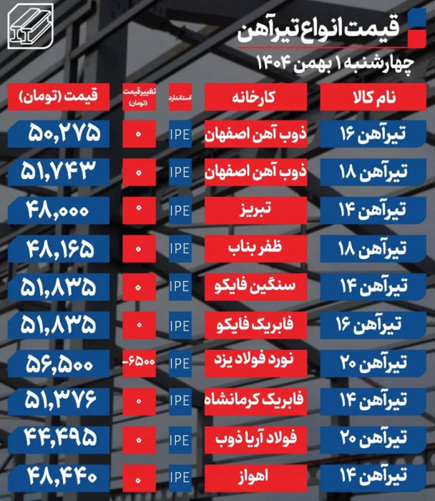 قیمت تیرآهن امروز 1 بهمن ۱۴۰۴