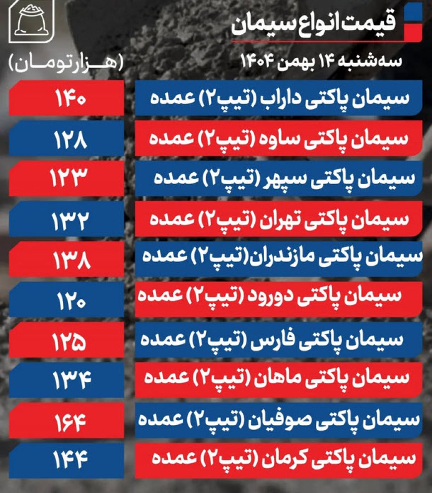 قیمت سیمان امروز ۱۴ بهمن ۱۴۰۴