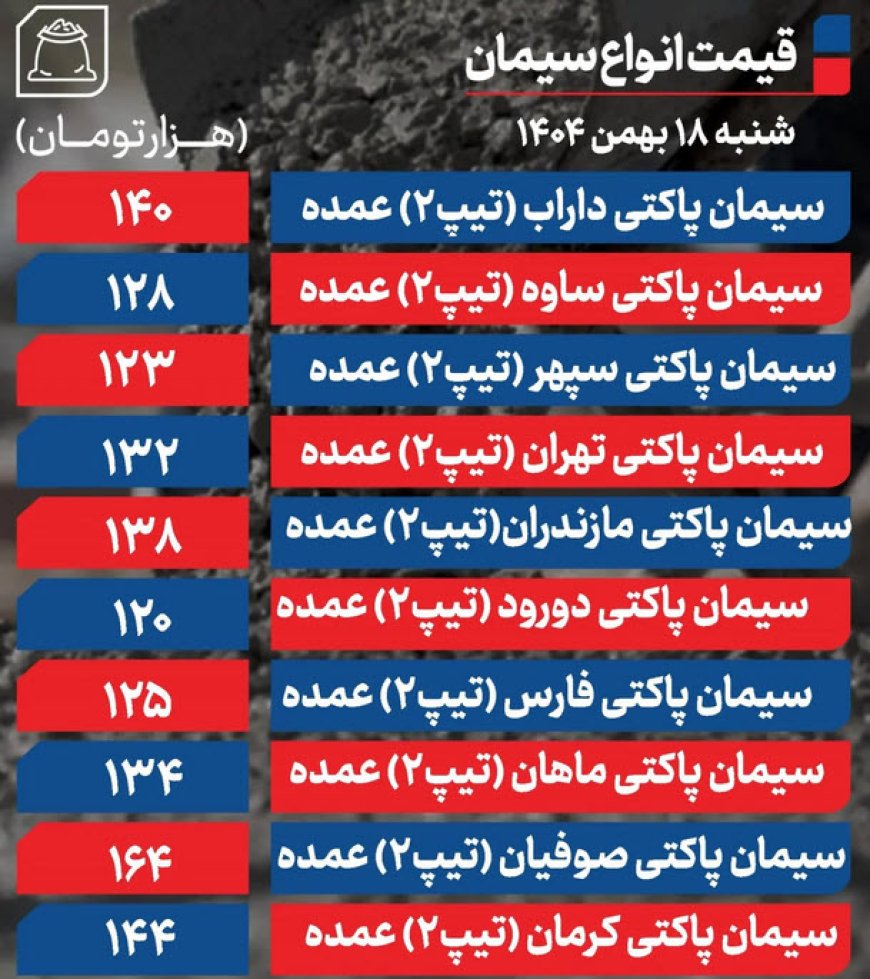 قیمت سیمان امروز ۱۸ بهمن ۱۴۰۴ اعلام شد. بازار نخستین روز هفته را با ثبات در محصولات آغاز کرده است.