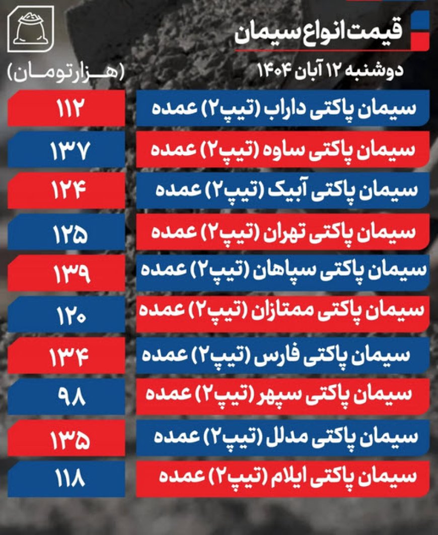 قیمت سیمان امروز 12 آبان ۱۴۰۴ اعلام شد. بازار از حرکت ایستاده و تغییر بهایی را مشاهده نمیکند.