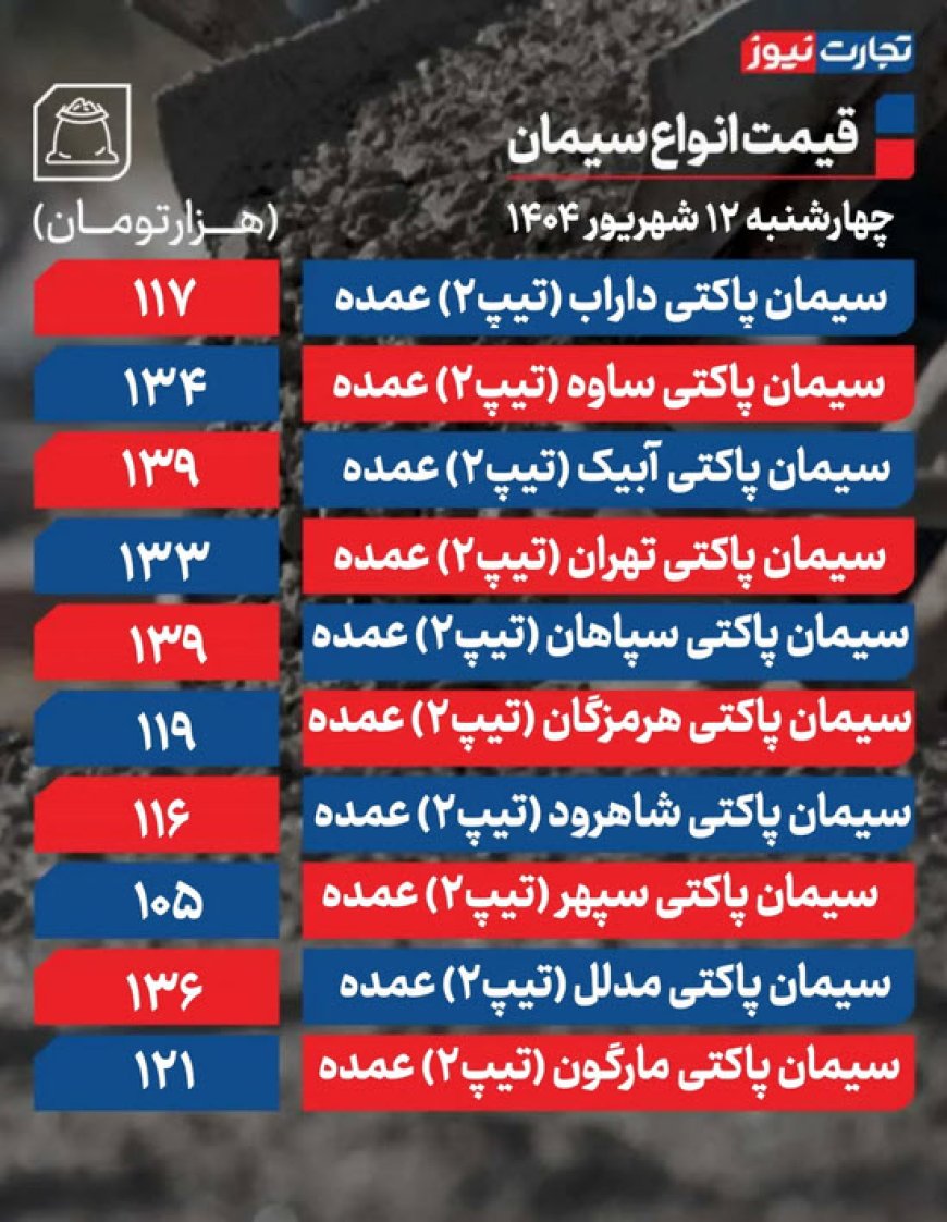 قیمت سیمان عمده امروز ۱۲ شهریور ۱۴۰۴ اعلام شد. تنها یک محصول افزایش بها را تجربه کرده است.