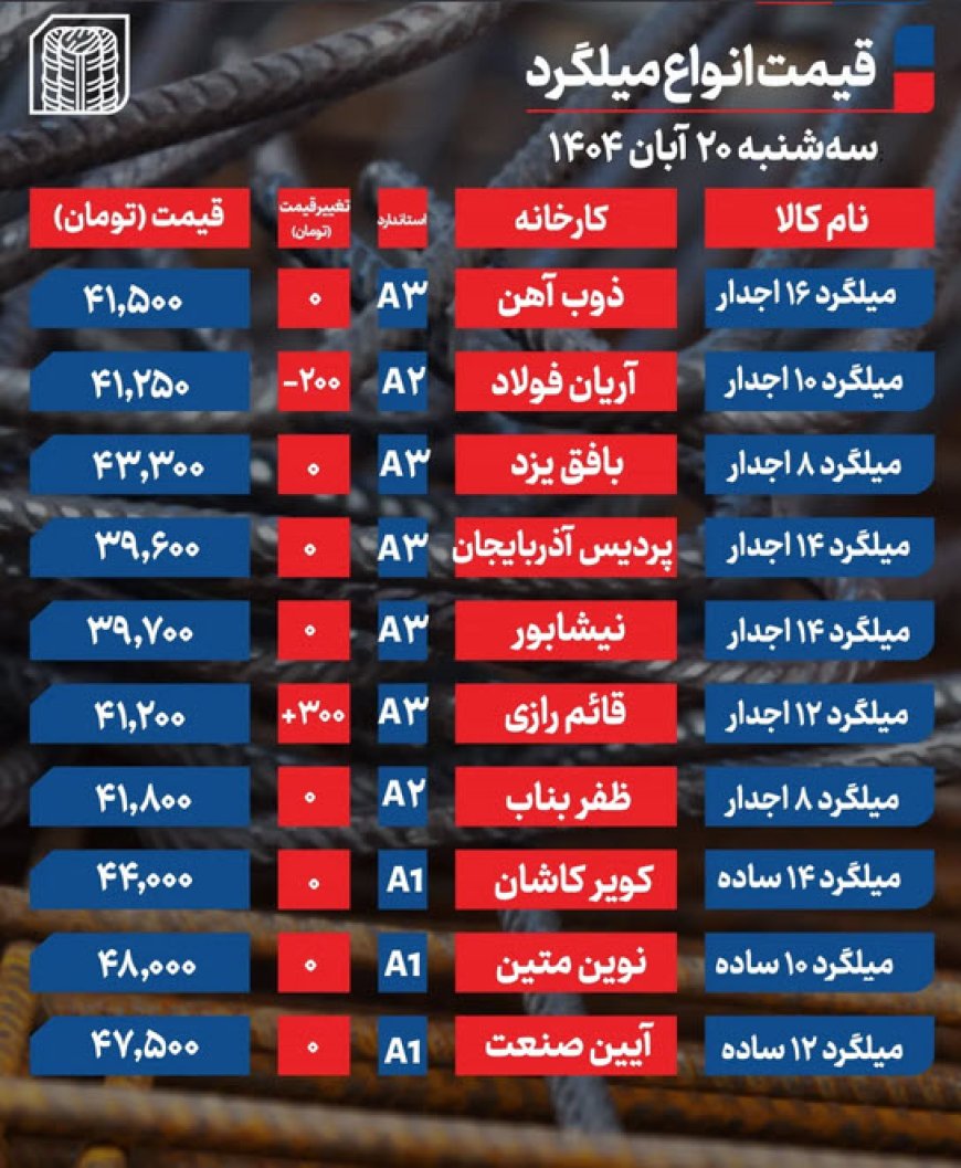 قیمت میلگرد امروز ۲۰ آبان 1404