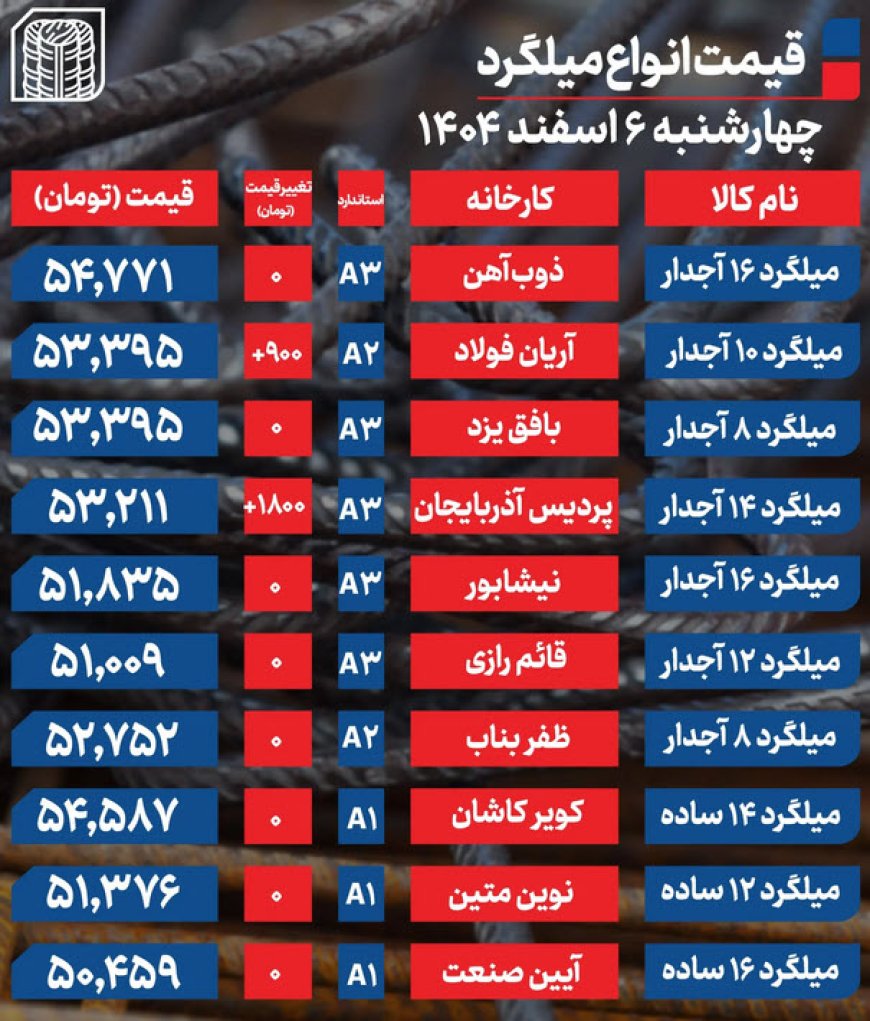 قیمت میلگرد امروز ۶ اسفند ۱۴۰۴