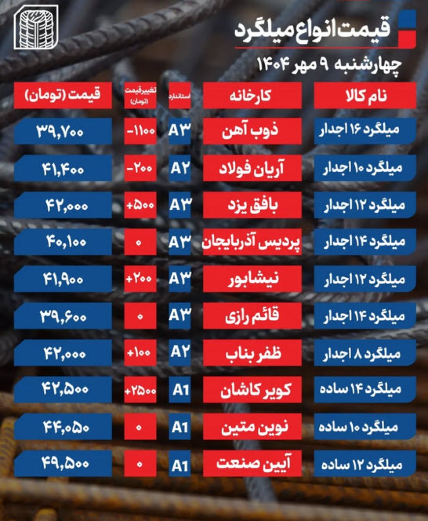 قیمت میلگرد امروز ۹ مهر ۱۴۰۴