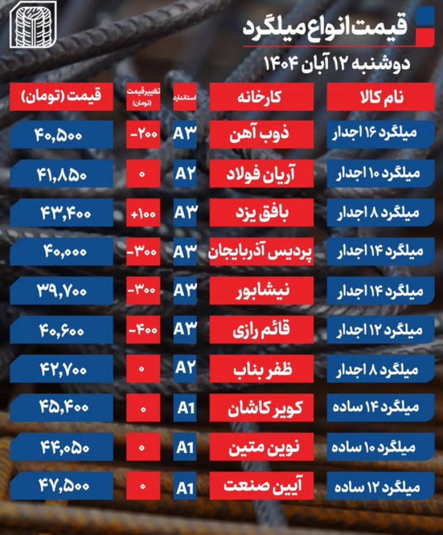 قیمت میلگرد امروز 12 آبان 1404