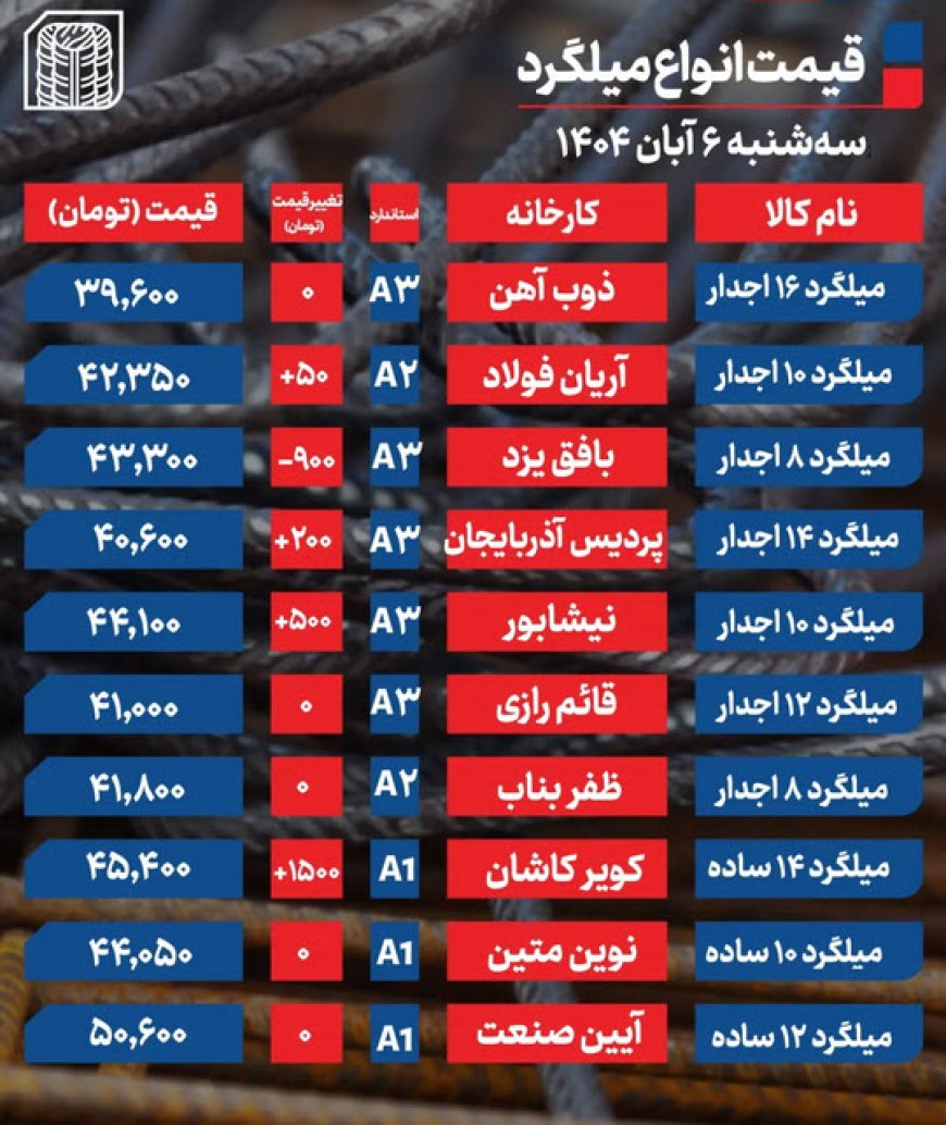 قیمت میلگرد امروز ۶ آبان ۱۴۰۴ اعلام شد. بازار میلگرد امروز با افزایش نسبی تحرکات معاملاتی مواجه شد.