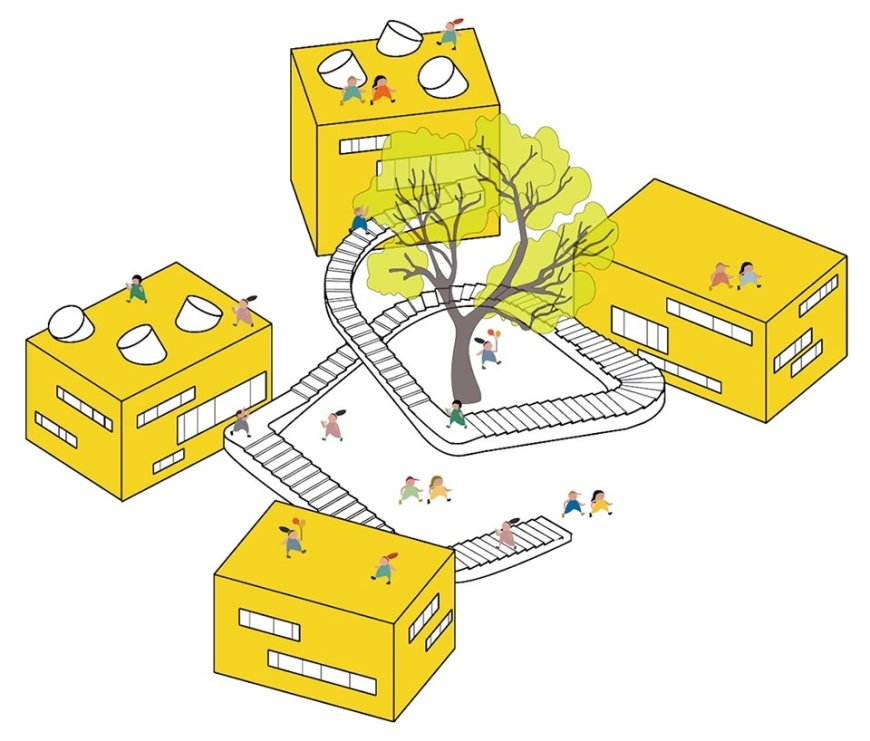 طراحی آن از ایده «آسمان» الهام گرفته و شامل مسیرهای حلزونی است که فضاهای فعالیت را به هم متصل میکند. پشت بام به عنوان زمین بازی طراحی شده تا کودکان بتوانند نسیم را حس کنند و به دوردستها خیره شوند. چیدمان دایرهای، زیباییشناسی هماهنگی ایجاد کرده و اتصال روانی میان بخشها را تضمین میکند.